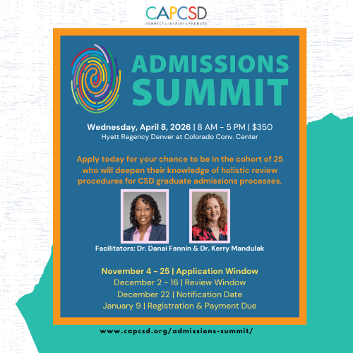 CAPCSD is now accepting applications to the 2026 Admissions Summit which will be held on Wednesday, April 8, 2026 leading up to the 2026 Annual Conference. There are seats for 25 participants in this day-long gathering of faculty members who are interested in deepening their knowledge of holistic review procedures for CSD graduate admissions processes. Selected applicants will have a registration fee of $350 and will earn 0.75 ASHA CEUs.